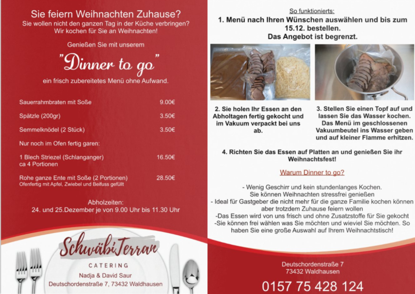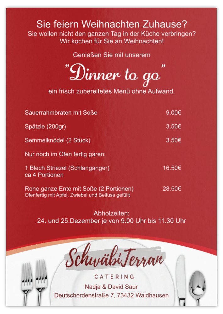 An ein tolles Fest erinnert man sich noch lange zurück. Darum liefern wir Ihnen als Partyservice für Aalen und Umgebung ein ausgezeichnetes und vielfältiges Essensangebot passend zu Ihren Ansprüchen. Ob die familiäre Feier bei Ihnen zu Hause oder ein großes Fest in angemieteten Räumlichkeiten, David Saur und Nadja Schiele entwickeln das passende kulinarische Begleitprogramm und die richtigen Ideen, damit Ihre Feier zu einem unvergesslichen Erlebnis wird.